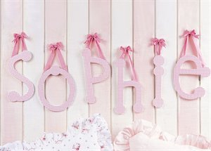 Our gingham letters are available in pink and blue and hang on wall with coordinating ribbon. All letters are lowercase and are approximately 9'' tall and 5'' wide.